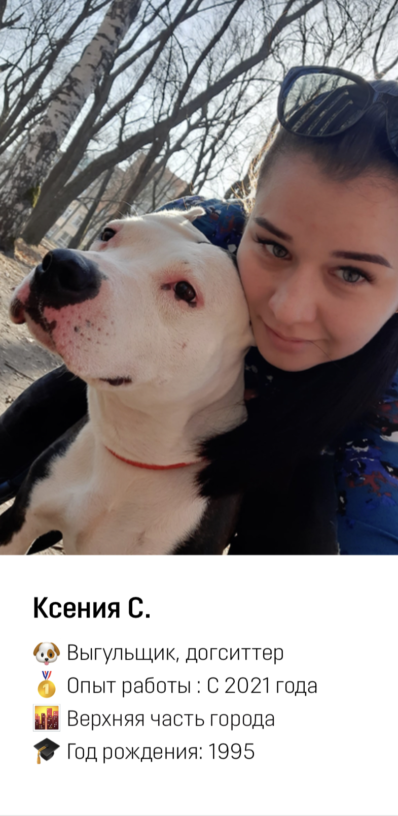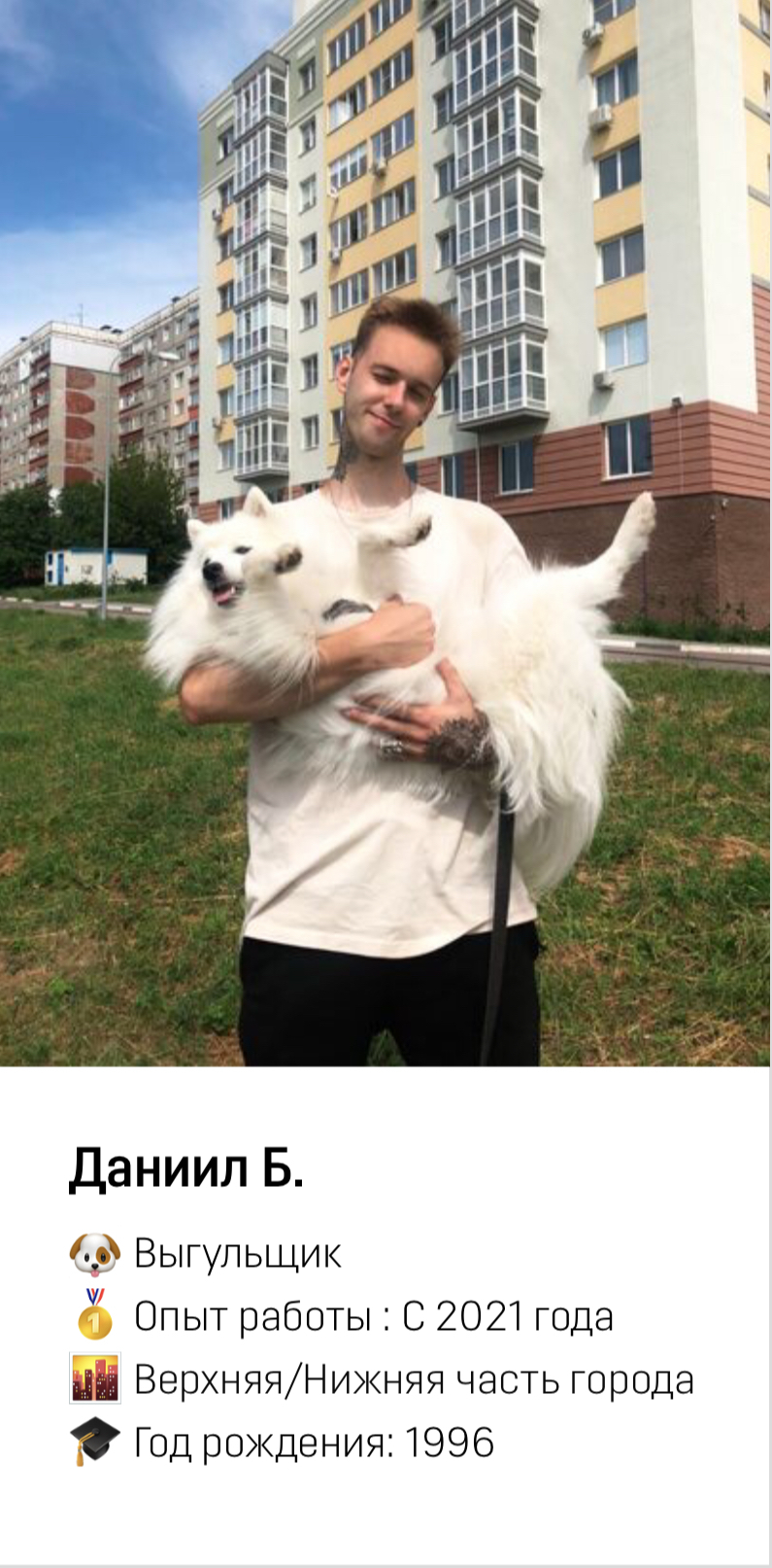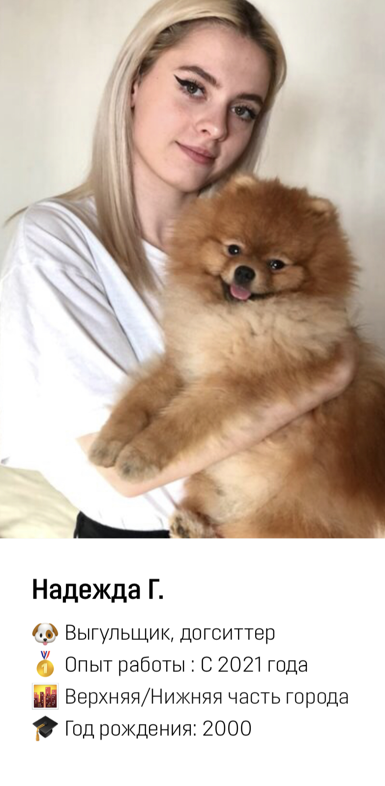 Сотрудник приезжает к вам домой и заботится о вашем питомце (гуляет, играет с ним). Происходит всё тоже самое, что и на передержке, но уже на вашей территории.