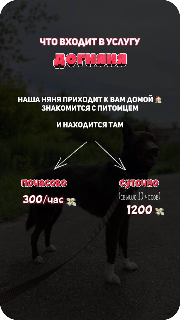 Сотрудник приезжает к вам домой и заботится о вашем питомце (гуляет, играет с ним). Происходит всё тоже самое, что и на передержке, но уже на вашей территории.